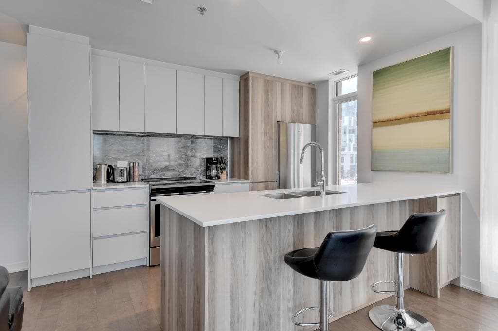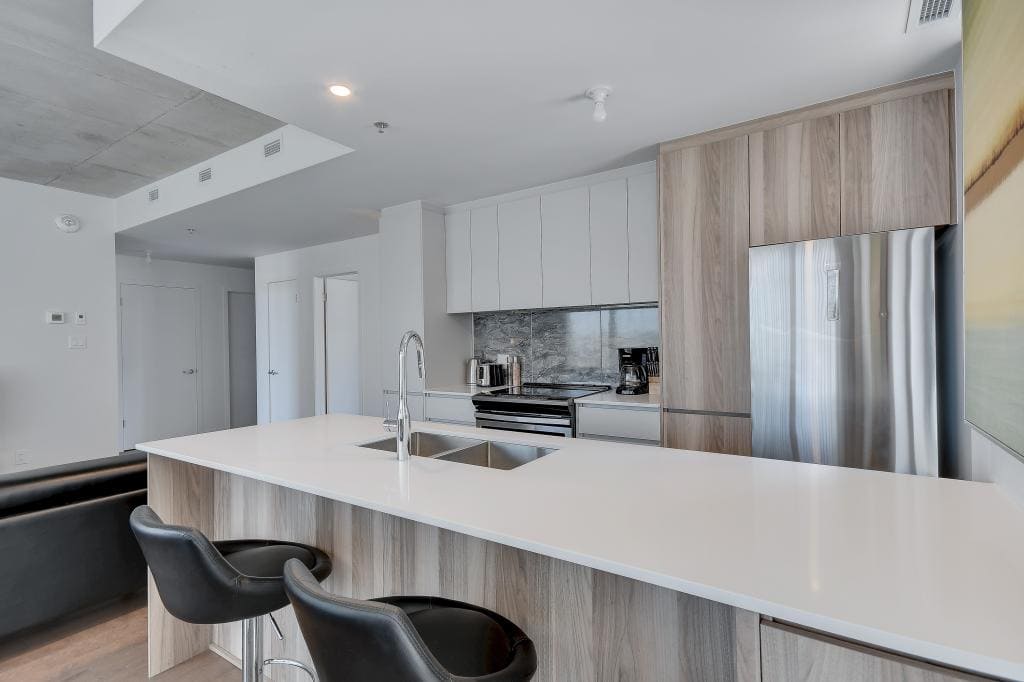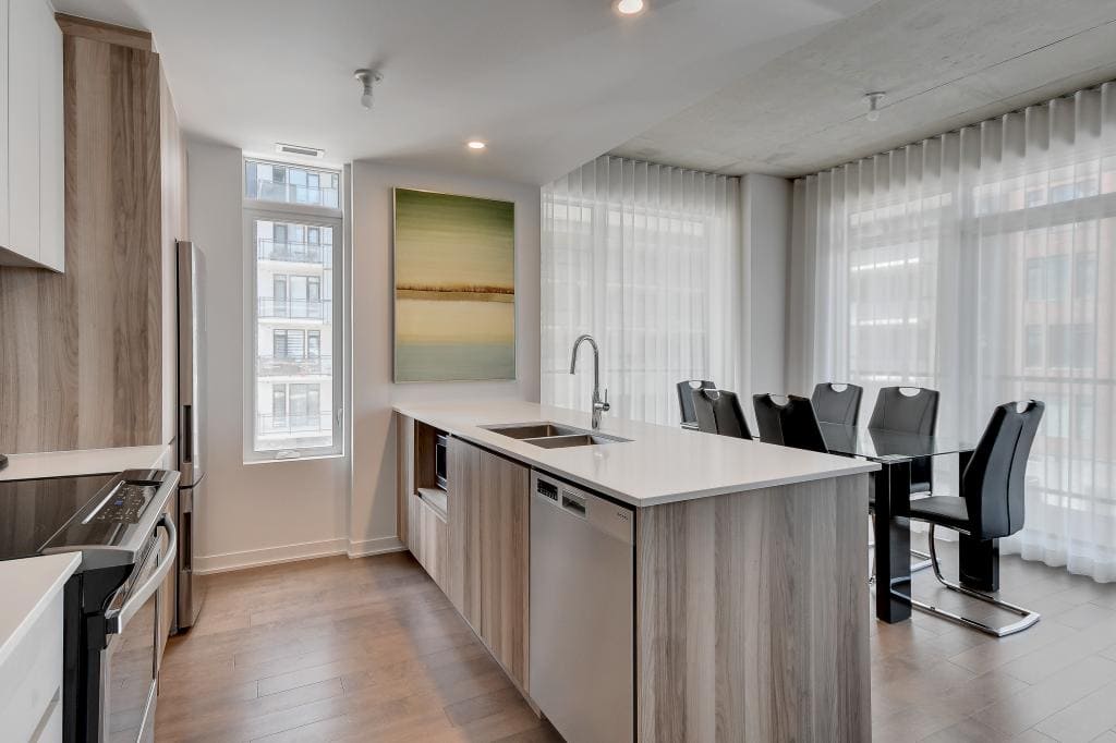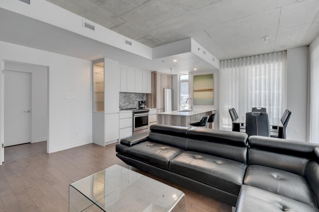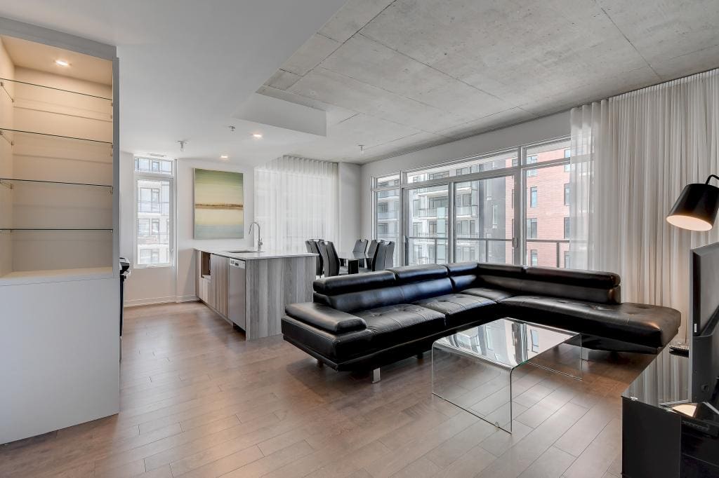 Au condo du Quartier, dès votre arrivée, vous vous sentirez chez vous. Grands espaces, plafonds hauts, lumière naturelle et vue magnifique sur la ville. Profitez également de la cuisine équipée avec comptoir-bar et du balcon privé.