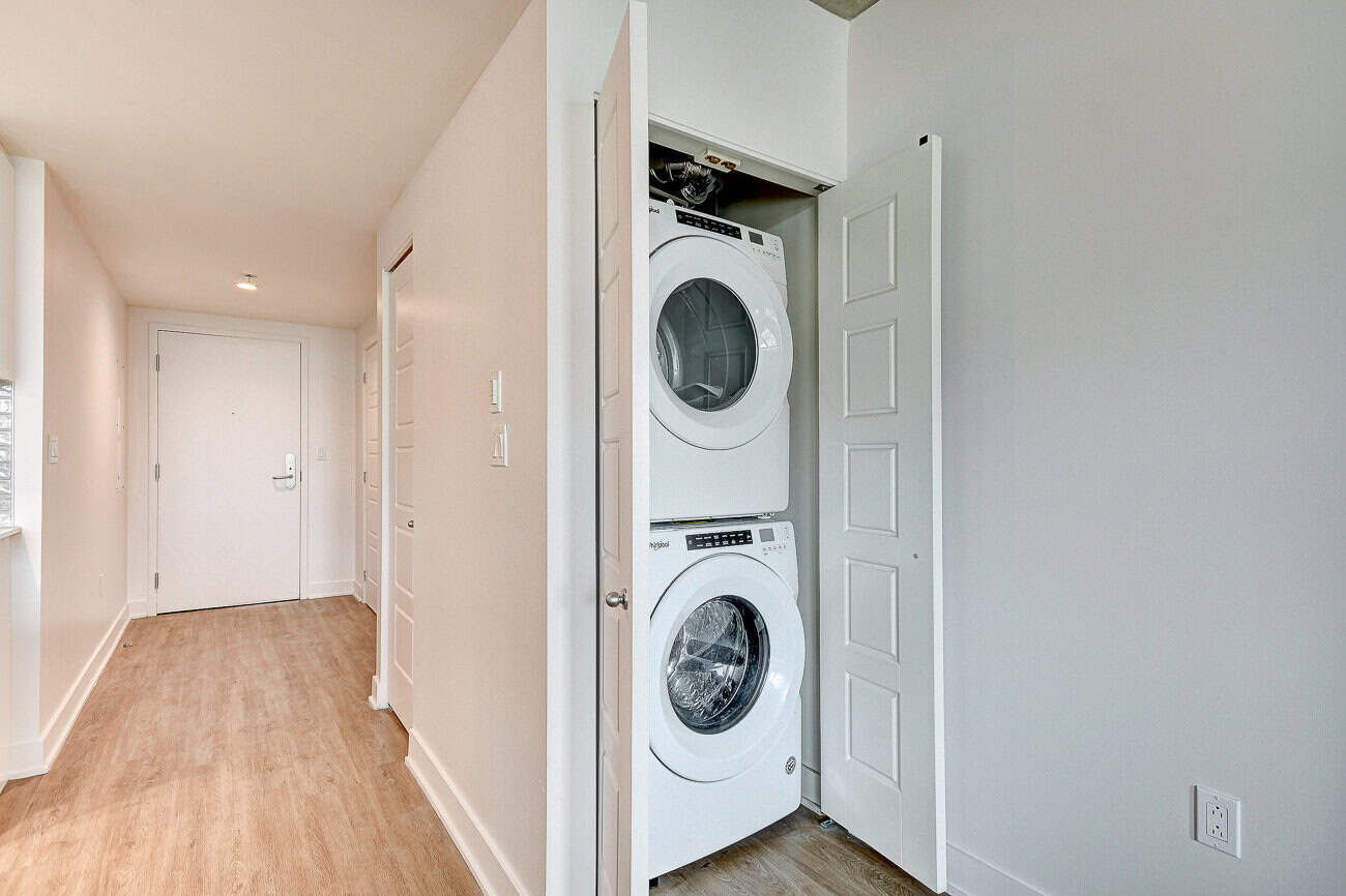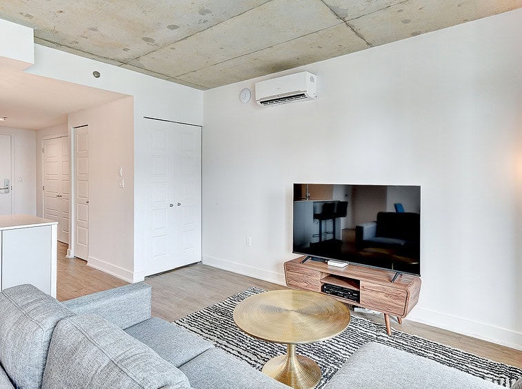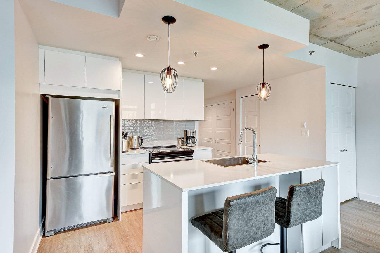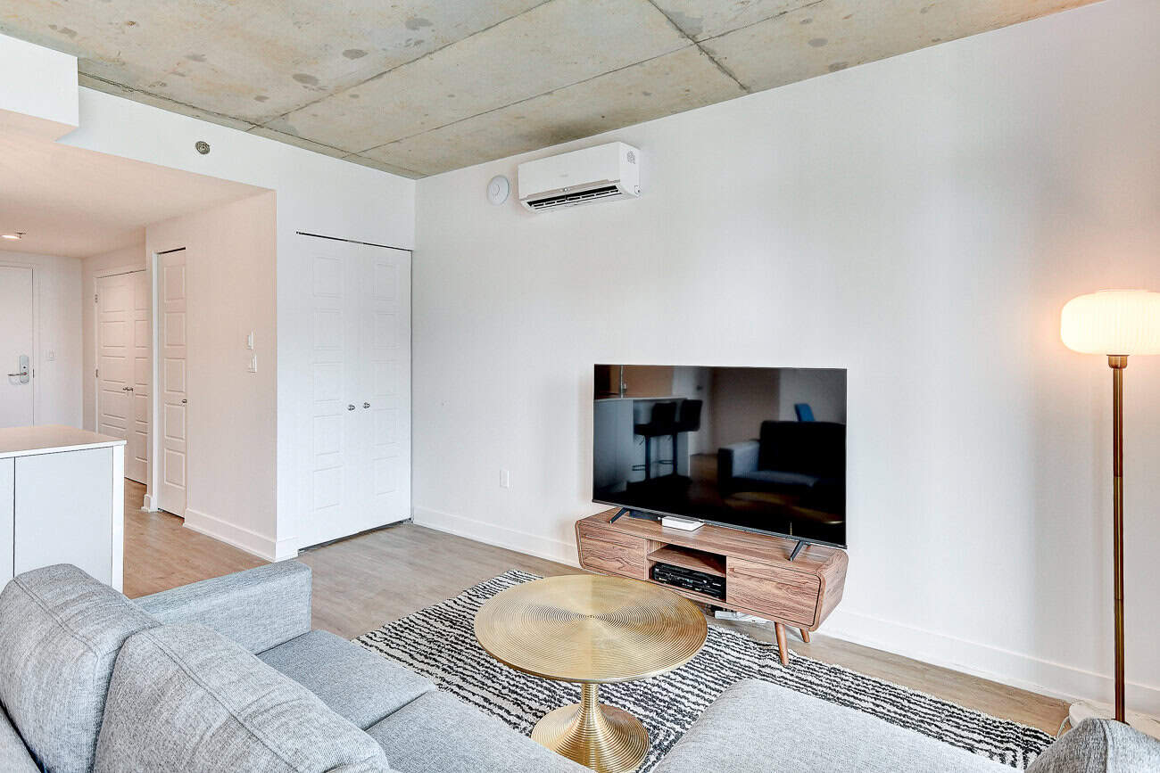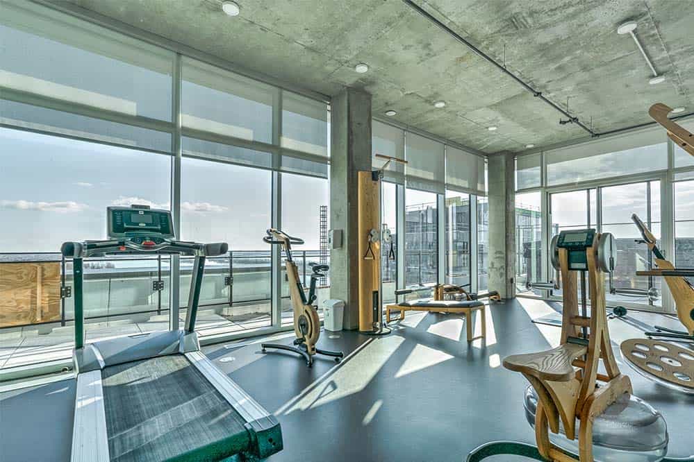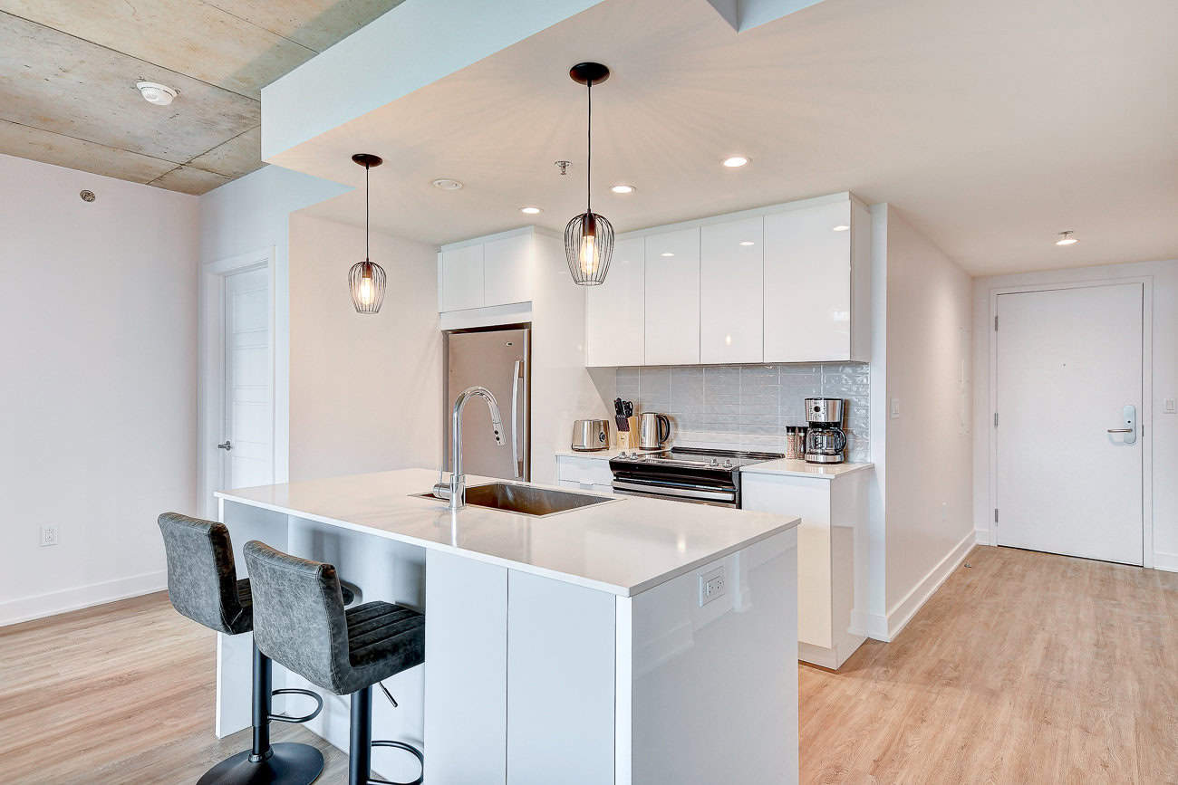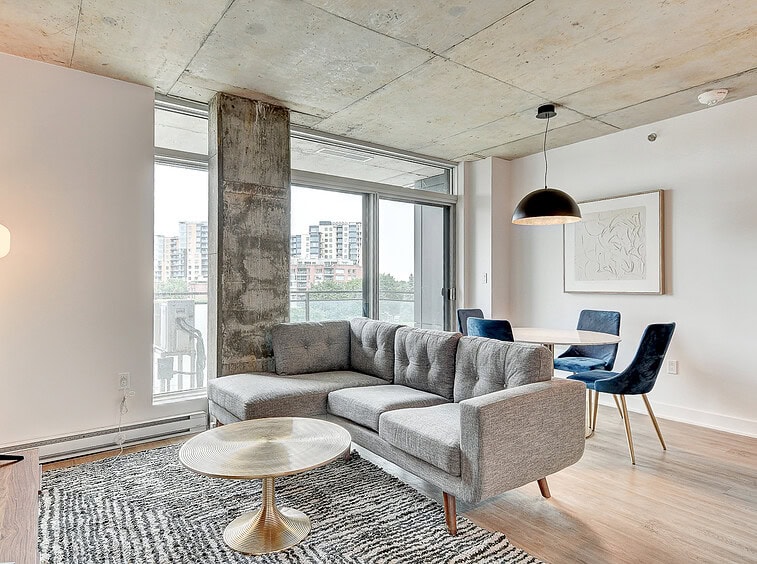 Bienvenue dans notre condo St-Laurent ! Sur le toit, vous attendent une salle de conditionnement et un chalet urbain style lounge avec foyer offrant des vues époustouflantes du fleuve, du pont Champlain et de la ville.
