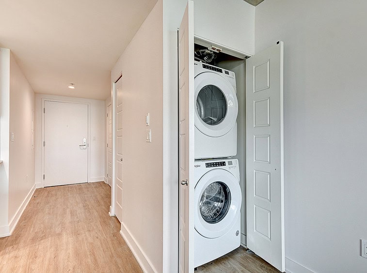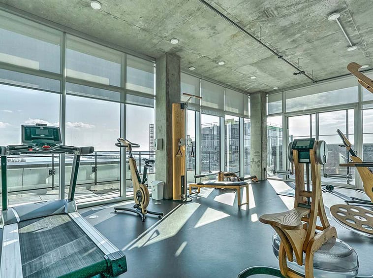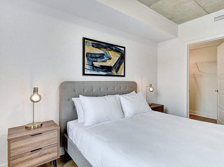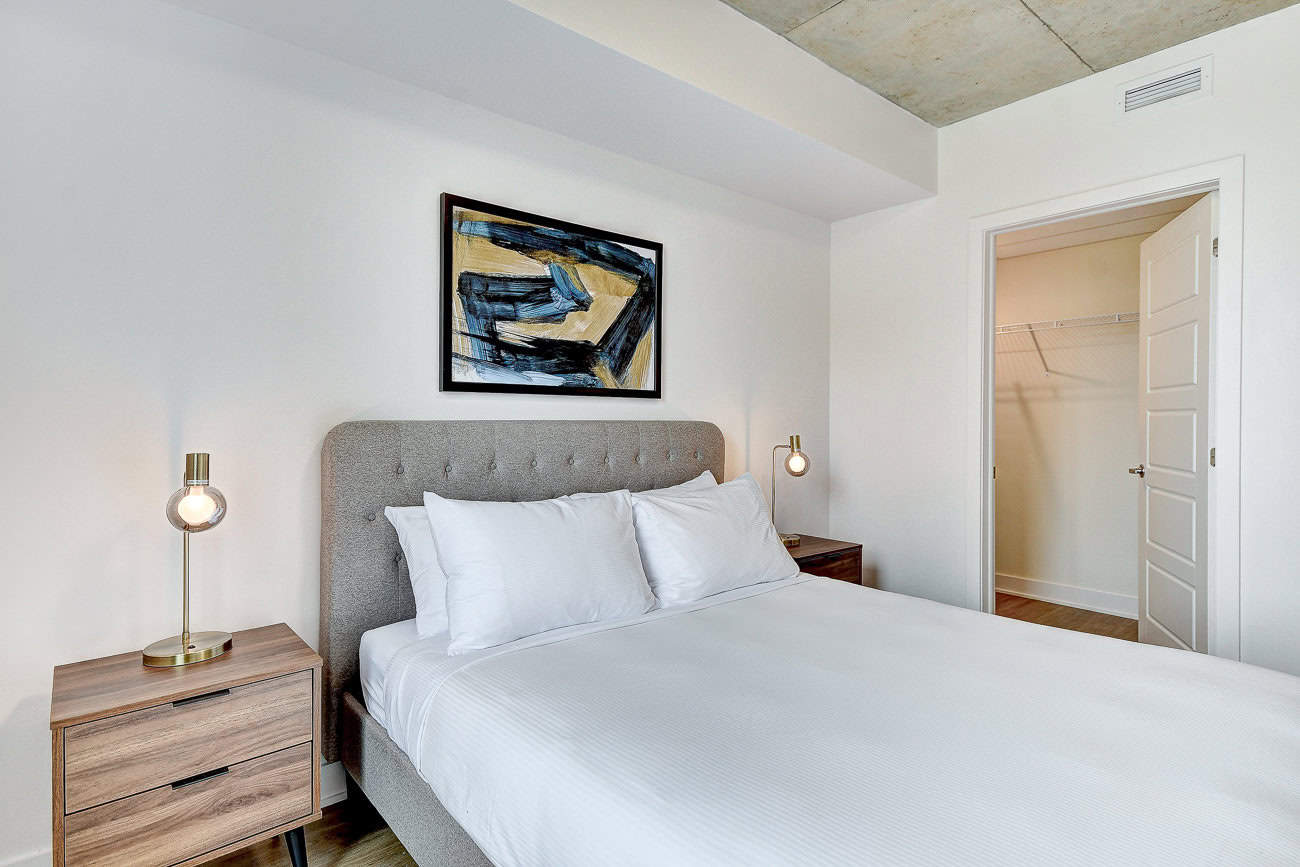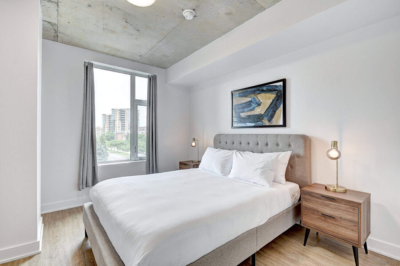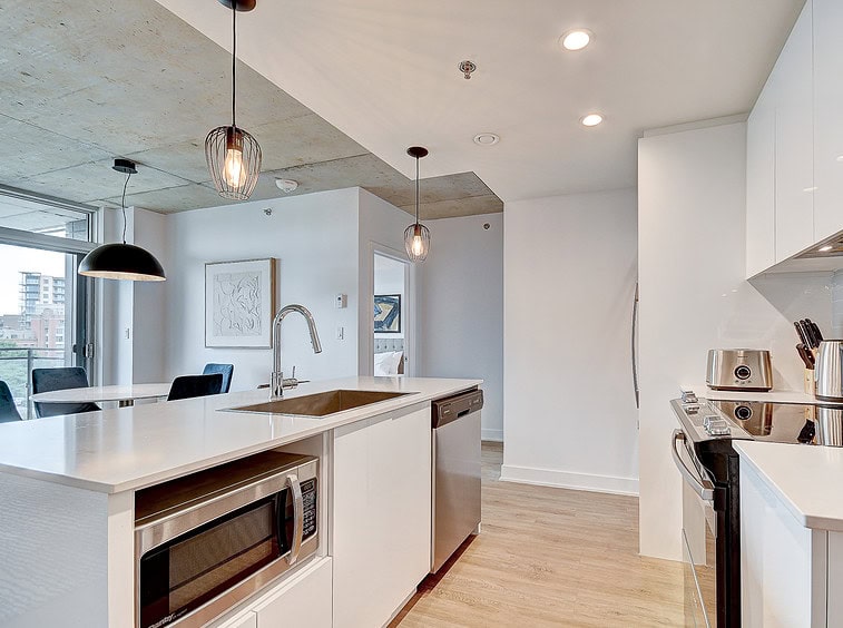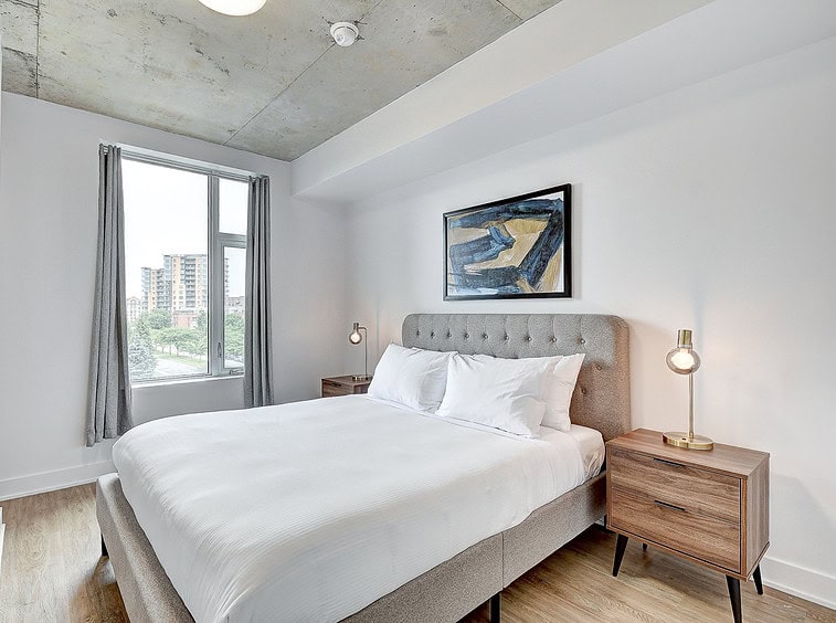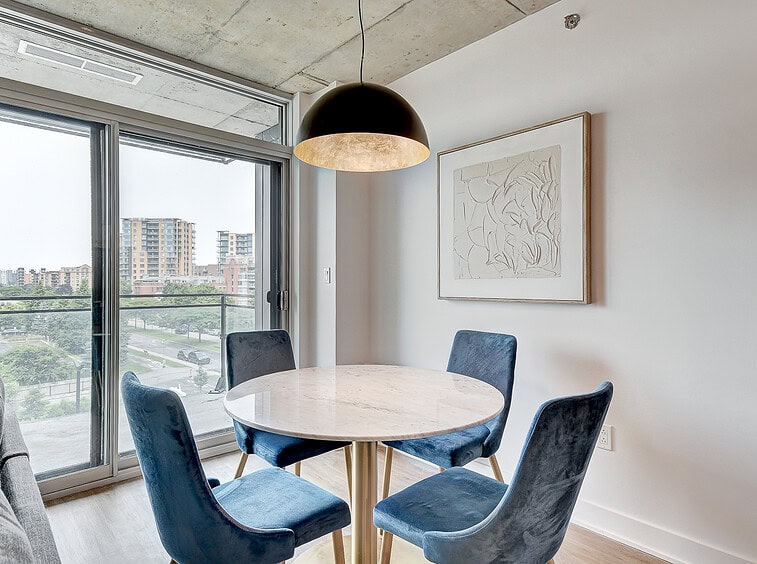 Bienvenue dans notre condo St-Laurent ! Sur le toit, vous attendent une salle de conditionnement et un chalet urbain style lounge avec foyer offrant des vues époustouflantes du fleuve, du pont Champlain et de la ville.