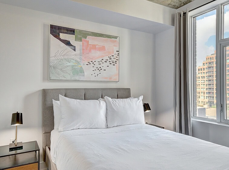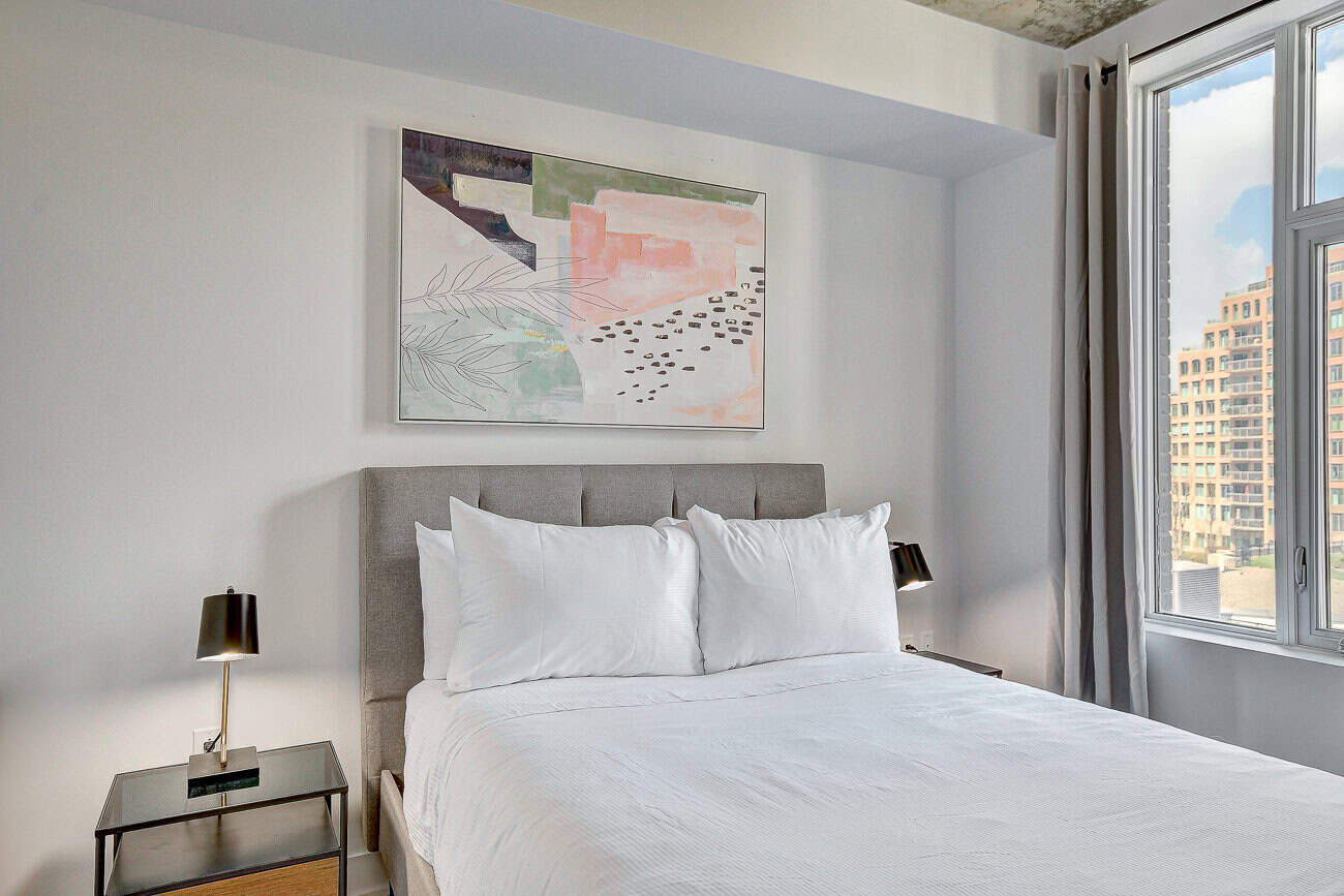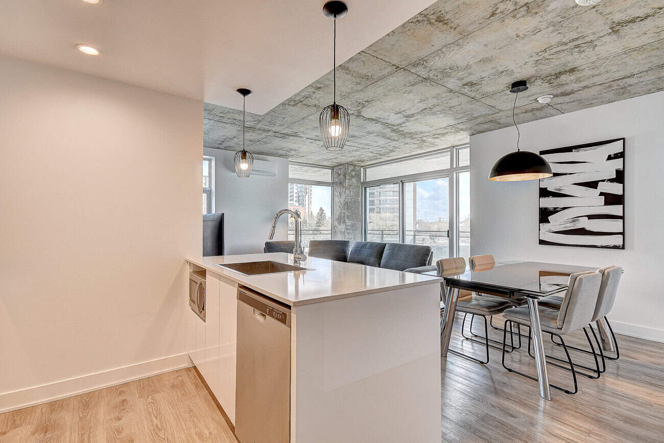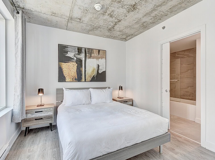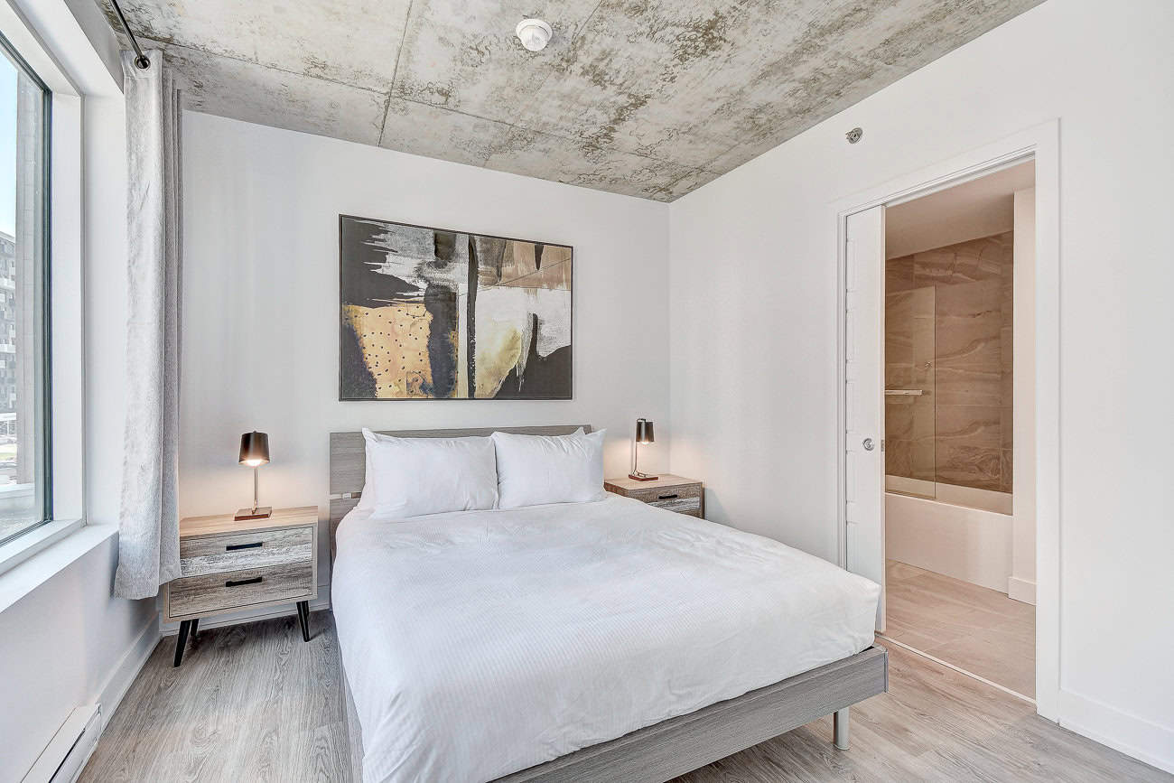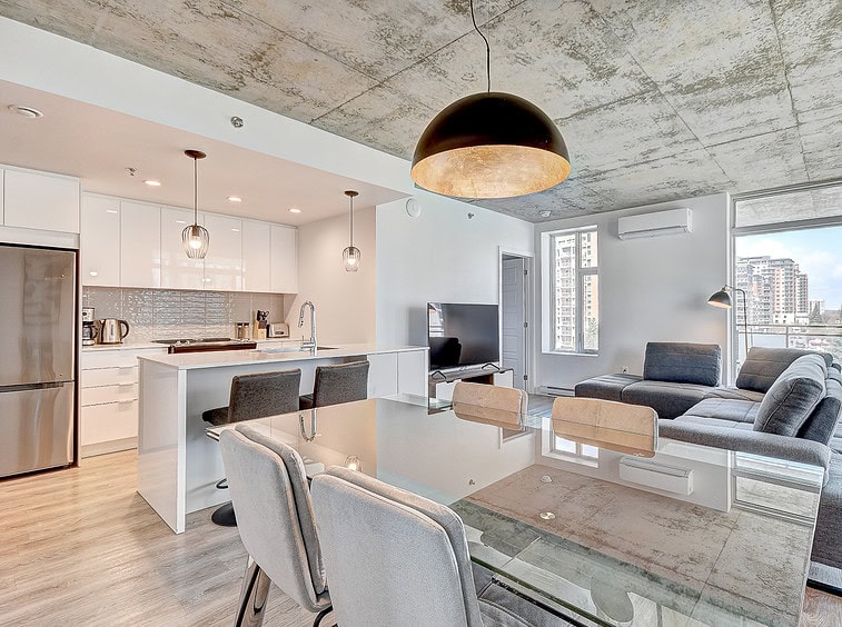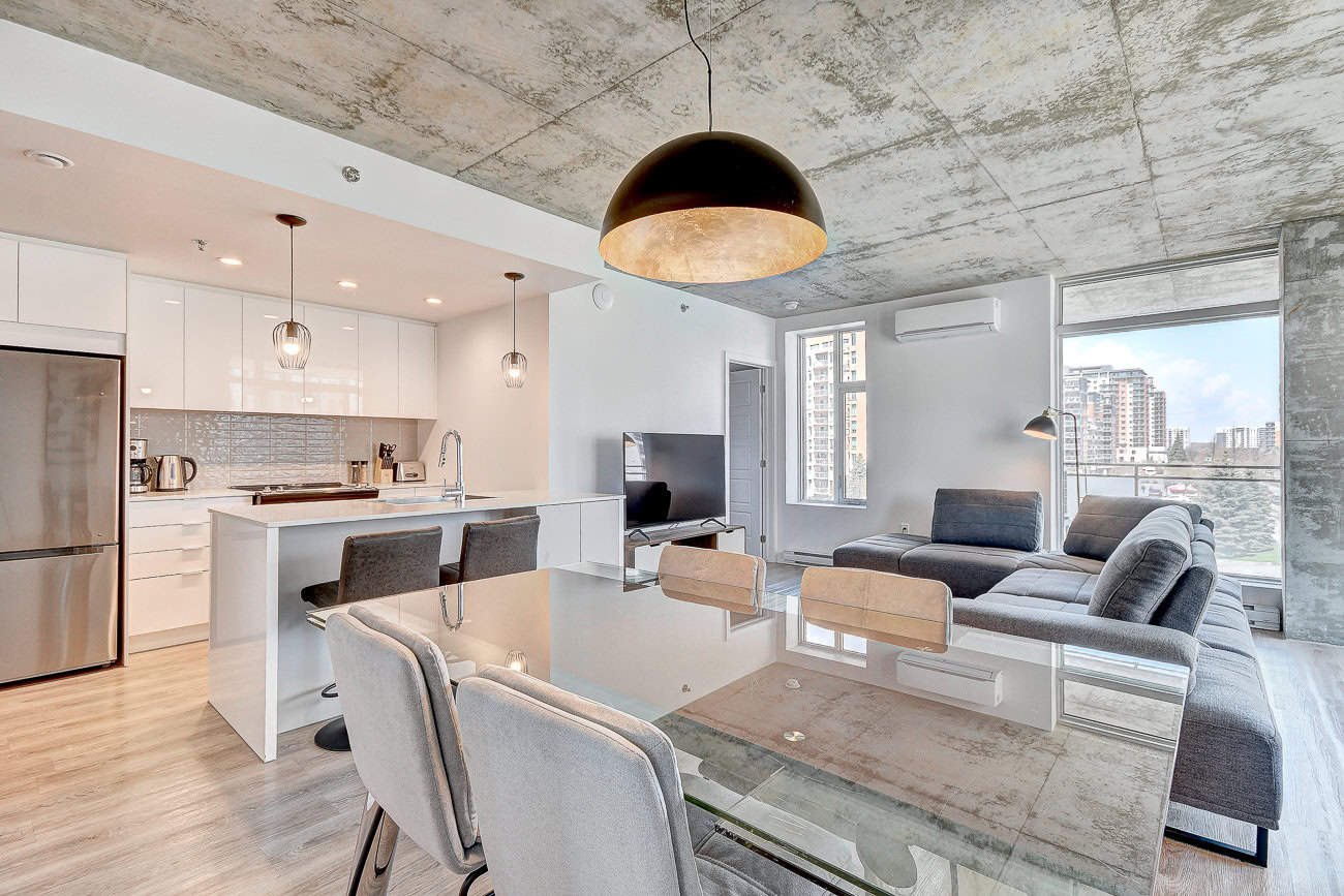 Bienvenue dans notre condo St-Laurent ! Sur le toit, vous attendent une salle de conditionnement et un chalet urbain style lounge avec foyer offrant des vues époustouflantes du fleuve, du pont Champlain et de la ville.